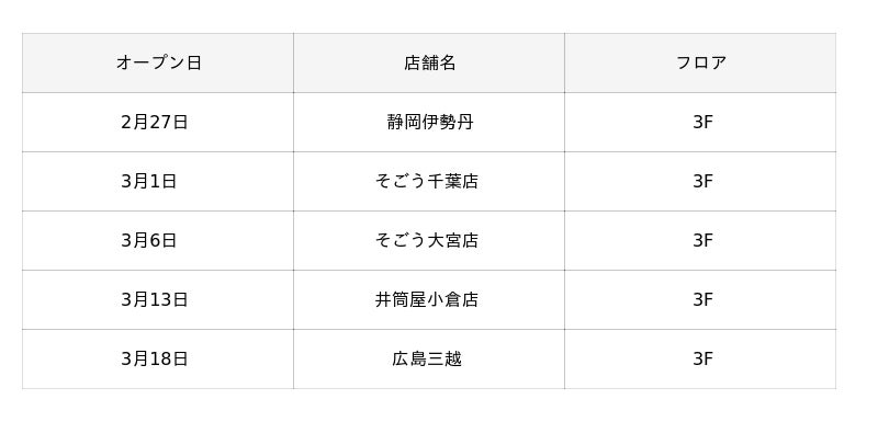 2026年2月より、以下の百貨店にて新店舗を順次オープンいたします。