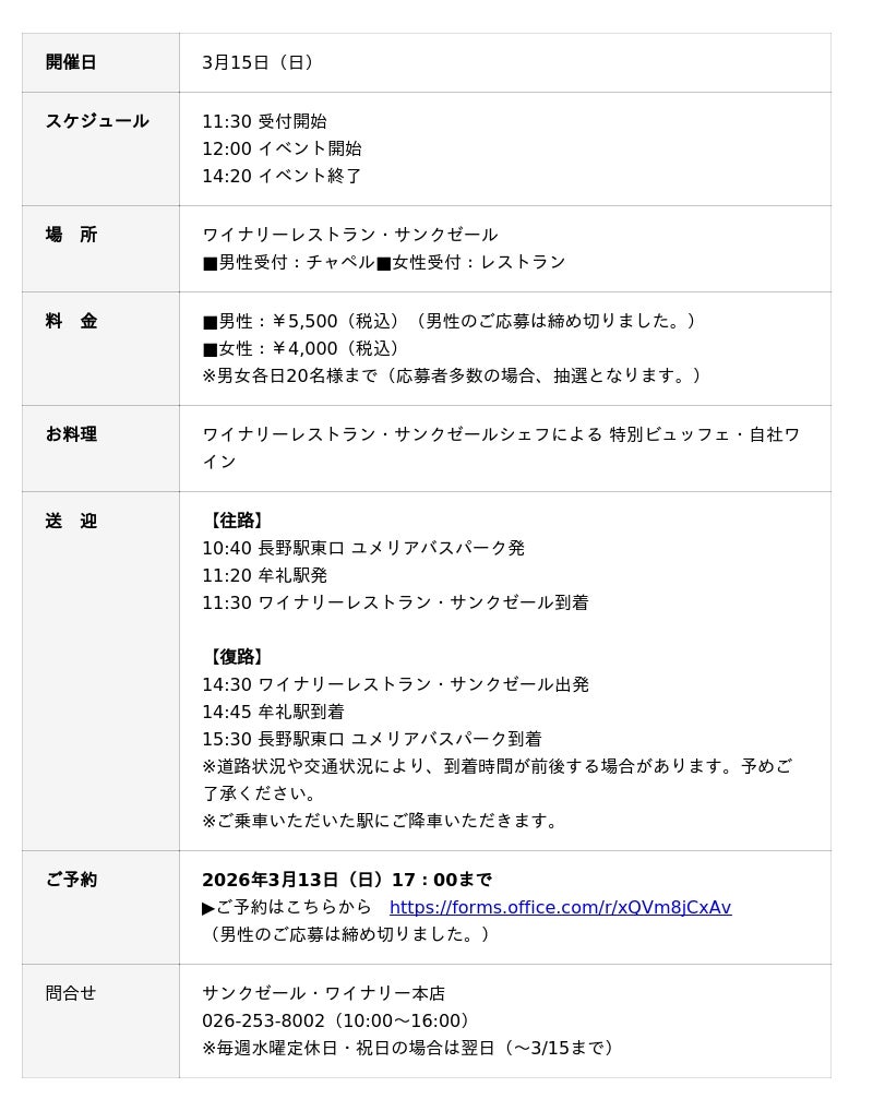 株式会社サンクゼール(本社:長野県飯綱町/代表取締役社長:久世良太)は、2026年3月15日(日)、飯綱町のワイナリーレストラン・サンクゼールにて、飯綱町社会福祉協議会との共催により婚活パーティ「ワイン de ご縁 ~美味しい時間と素敵な出逢い~」を開催いたします。この記事では、毎回ご好評のシェフが腕を振るったお料理と、ヴィニュロンが心を込めて醸したワインのラインナップをご紹介します。