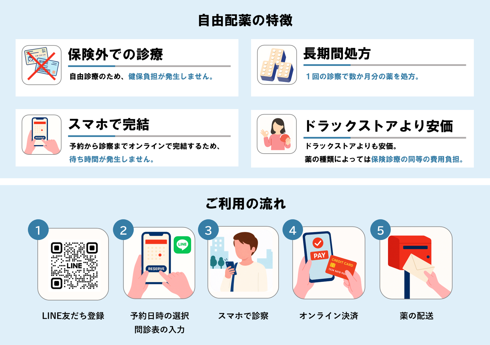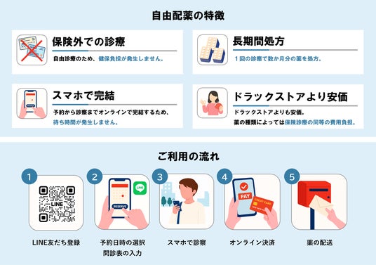 健康保険組合の財政状況は医療費の増加により年々厳しさを増しています。一方で医療提供の在り方も、花粉症のような症状でも、いつものお薬を受け取るために何度も通院しなければならない手間や薬局での長い待ち時間などに煩わしさがあります。また、ドラッグストアで販売されている市販薬は医師の診察がなく、処方薬と比較して費用負担が大きく、選択肢にも限りがあります。当院ではこうした課題に対し、自由診療を活用することで利用者の利便性を向上させると共に健康保険組合の財政にも寄与する診療・処方を提案しています。■オンライン診療サービス「自由配薬」