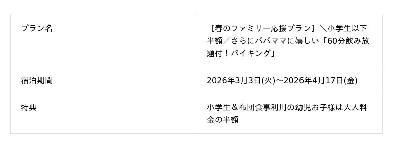 また、2026年3月3日(火)より、春のファミリー旅行向けプランの販売を開始いたしました。本プランでは、小学生および幼児のお子様料金が半額となるほか、大人の方には60分の無料飲み放題が付くお得な内容となっております。