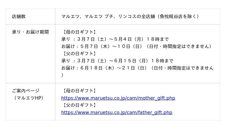 株式会社マルエツ(本社:東京都豊島区、代表取締役社長:本間 正治、以下:マルエツ)は3月7日(土)より、2026年「母の日・父の日ギフト」の承りを、店舗およびインターネットで開始いたしますので、お知らせいたします。
