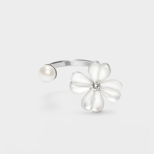 リングとブローチは淡水パールをプラスした上品なデザイン。 淡水パールの柔らかな光沢感が、白蝶貝の美しくゆらめく虹彩をよりひきたてます。