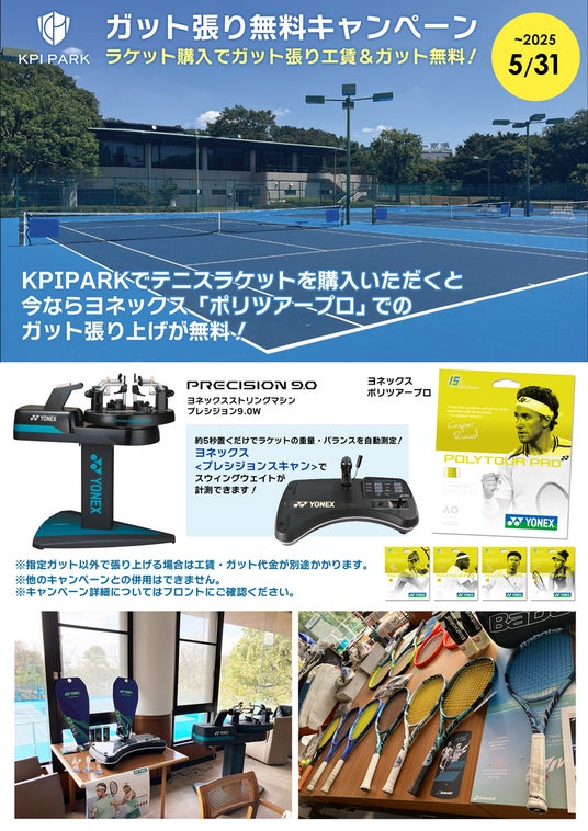 <KPI PARK>テニスラケットご購入でヨネックス「ポリツアープロ」での張り上げ無料キャンペーン実施!スウィングウェイトマシンでの計測も