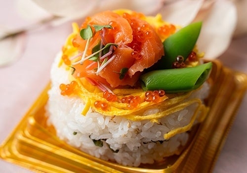 ゆず酢飯のちらし寿司の上には、バラに見立てたサーモンやいくらが乗っています。華やかな寿司ケーキは母の日の食卓を彩ります。