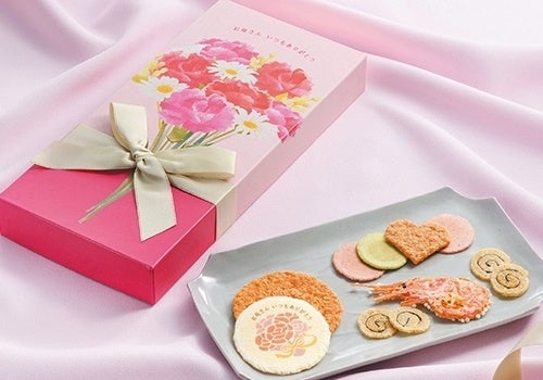 カーネーションの花束をイメージした限定パッケージ。中には定番のえびせんべいや母の日ならではのメッセージ入りせんべいもご用意しております。