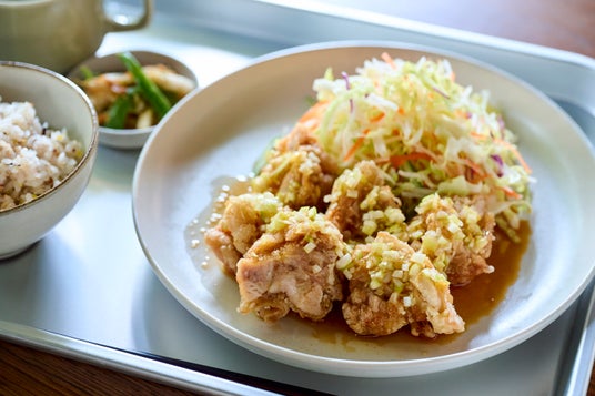 チキンの竜田揚げ定食(写真は黒酢葱ソース)