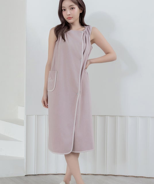 ずり落ちにくくて安心感のある、袖を通すワンピースデザイン。バストトップが目立ちにくいタオル地を使用しているので、視線を気にすることなく1枚で着用できるのも嬉しいポイント。