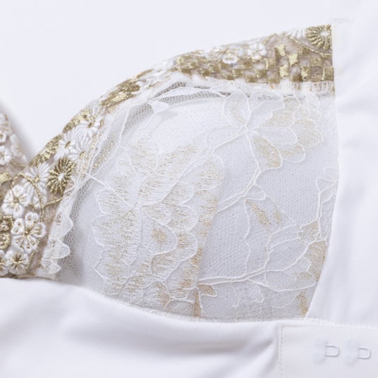 繊細な煌めきのレース繊細なレースに金糸を織り込むことで、上品な華やかさと贅沢なきらめきをプラスしました。まるでベールを纏うように、あなたの魅力にそっと奥行きを与えます。隠すほどに溢れ出す美しさを、特別な日も日常も、輝かせてくれる一枚です。自信とときめきを、ぜひ感じてください。