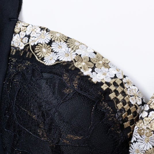 縁起柄が織りなす、和柄の襟元和柄の金刺繍が他にはない上品で華やかなアクセントを添えます。市松模様は未来への希望、菊は高貴さと清らかさ、桜は新たな始まりを象徴し、春の訪れと共に豊かさをもたらします。和柄刺繍がまるでお守りのようにあなたを包み込み、日々の装いに華やかさと自信をもたらします。