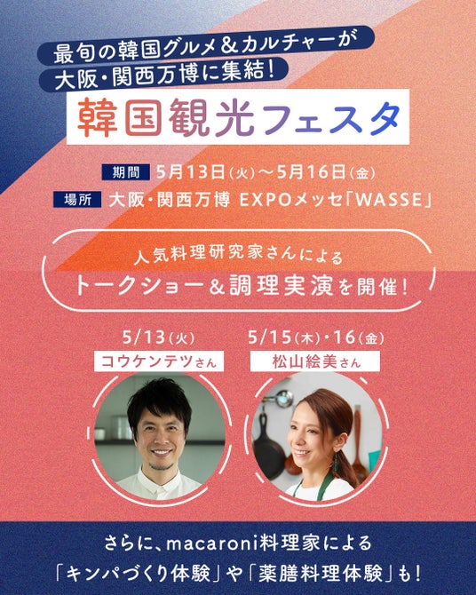 2025 年5 月、大阪・関西万博の公式会場「EXPO Exhibition Center WASSESouth」にて、韓国の食と文化を多彩なコンテンツで楽しめる「韓国観光フェスタ」が開催されます。