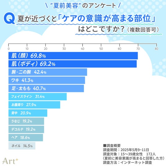 続いて、前問で“夏前に美容意識が高まる”と回答した人に、特にケアの意識が高まるパーツを尋ねたところ、「肌(顔)」(69.8%)、「肌(ボディ)」(69.2%)、「腕・二の腕」(42.4%)が上位に挙がりました。