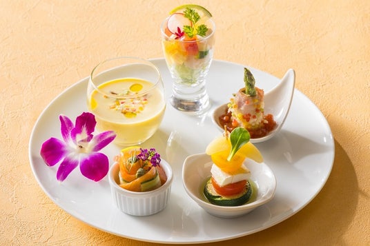 【別添え・セイボリー】桃とクリームチーズのカプレーゼ風、スモークサーモンとキュウリのルーロー グレープフルーツ添え、イタヤ貝のサラダパッションフルーツソース、冷製コーンスープ、グリーンアスパラガスとベーコンのフリット トマトソース