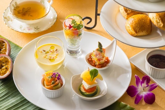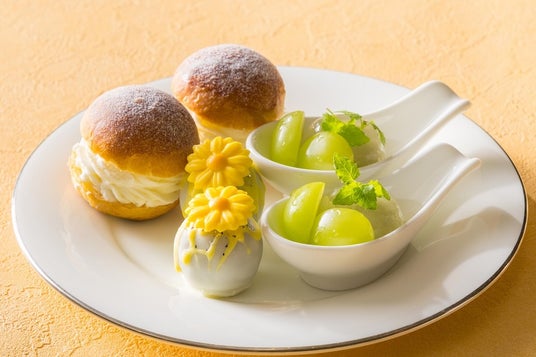 セイボリーにも季節の美味しさを取り入れ、桃とクリームチーズのカプレーゼ風ピンチョス、スモークサーモンとキュウリをくるりと巻き、グレープフルーツを添えたさっぱりとした味わいのルーロー、パッションフルーツソースを合わせたイタヤ貝のサラダ仕立てなど、食材の組み合わせにこだわったメニューで、夏らしい彩りと味わいを演出します。