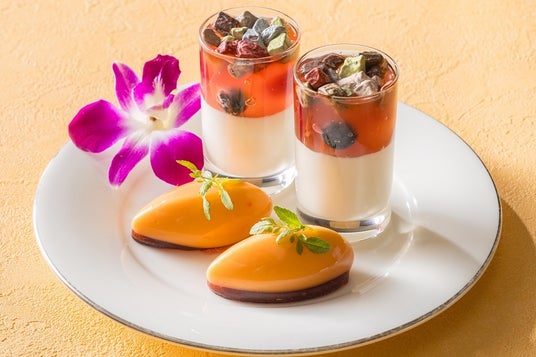 【上段】アセロラのジュレとココナッツムースのヴェリーヌ、マンゴーとパッションフルーツのムース
