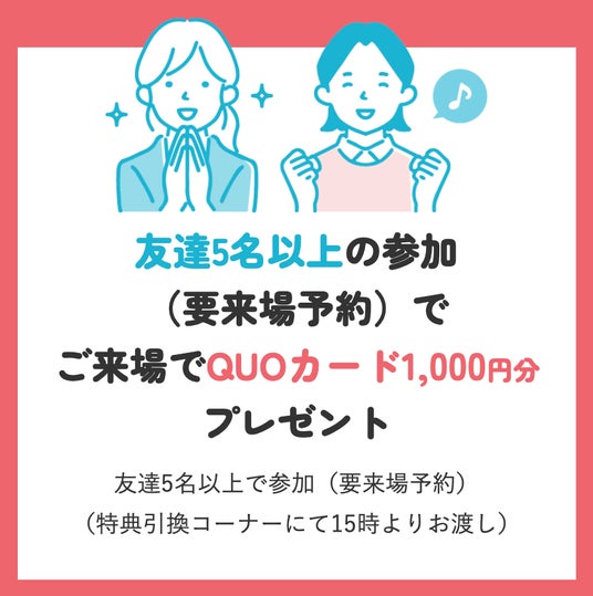 友達5名以上の参加(要事前予約)でQUOカード1,000円プレゼント!
