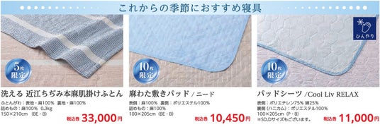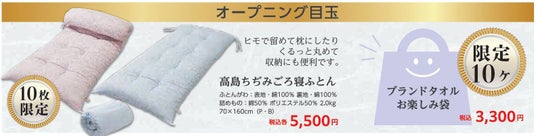 『初夏の寝具大ご奉仕会』の開催を記念して、高島ちぢみごろ寝ふとん、ブランドタオルお楽しみ袋を特別価格でご提供!それぞれ数量限定での販売となりますので、ぜひお早めにお立ち寄りください。
