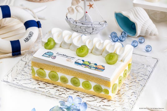 マリンパーティを彩る「すみっコショートケーキ」は、ふわふわとした食感の生地に瑞々しいシャインマスカットを乗せ甘さ控えめの軽やかな生クリームを絞った素材の味を活かしたシンプルな一品です。