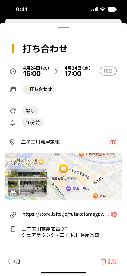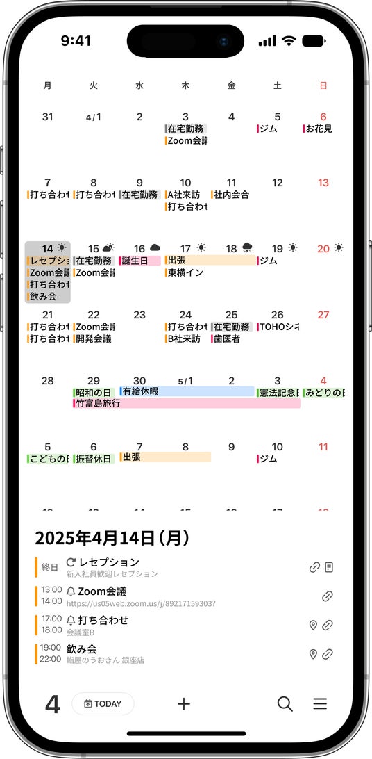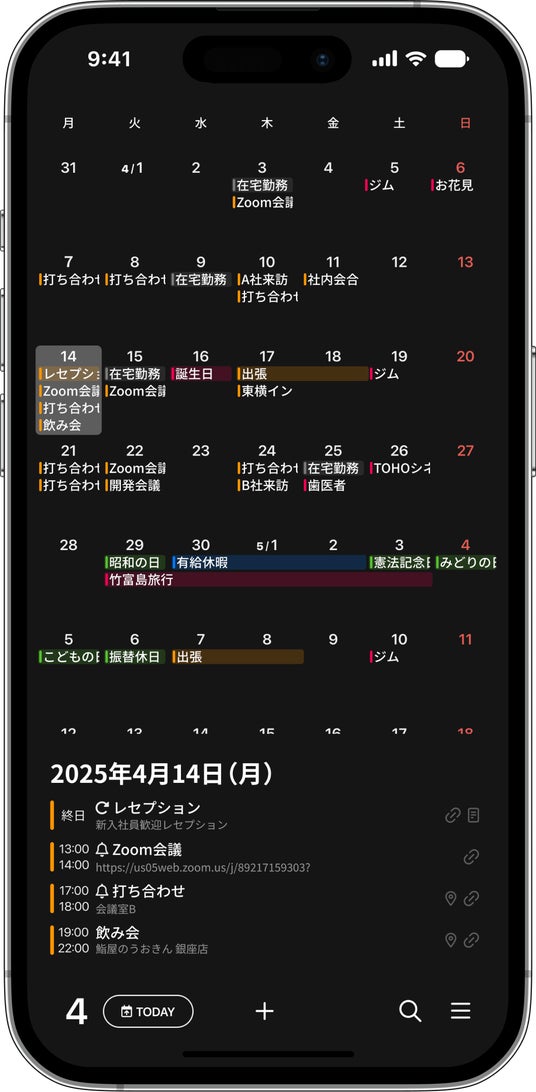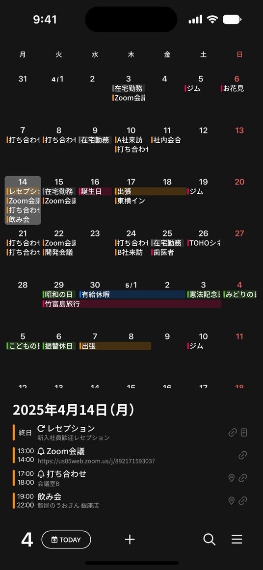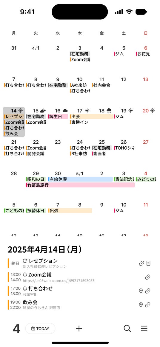 縦スクロール型カレンダー:月の区切りを意識せず、縦方向に自由にスクロールでき、1画面内で月全体の予定と1日の詳細スケジュールを同時に確認可能。