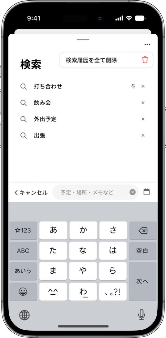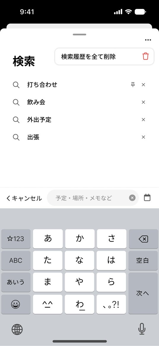 検索履歴のピン固定機能:特定の予定やキーワードをピンで固定することで、繰り返し行う検索をよりスピーディーに。