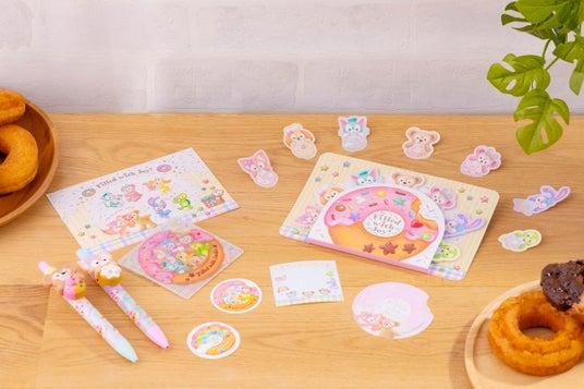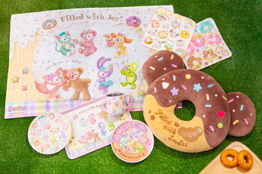 また、おうちでのティータイムやピクニックをにぎやかにお楽しみいただけるグッズが登場します。ステンレスマグカップやトレー、プレートセット、レジャーシートなどのグッズは、ドーナツを手に笑顔があふれるダッフィー&フレンズ7人全員がデザインされており、これらのグッズを使ってドーナツをおともにおやつの時間を楽しむのもオススメです。そのほか、チョコドーナツの形のクッションや、さまざまなドーナツが描かれたミニタオルセットや文房具など、毎日の生活が楽しくなるアイテムが登場します。