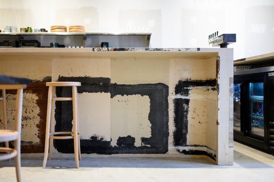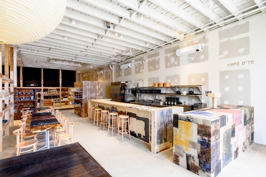 増床区画ではCIBONEの什器の一部やカフェのカウンター、テーブルの仕上げを和紙職人・ハタノワタル氏に依頼。柿渋で染めた和紙を貼り合わせた什器や、和紙染色の際に生まれる一枚ごとに表情が異なるあて紙を使用し、氏が初めて訪れたブルックリンの街並みからインスピレーションを受け現地でアドリブで仕上げたカウンターも50 Normanの新しい空間を彩っています。