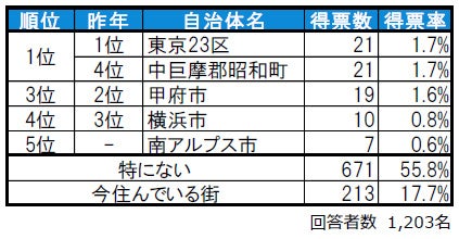 住みたい街1位は同率タイで東京23区(4年連続)と中巨摩郡昭和町。3位は甲府市。