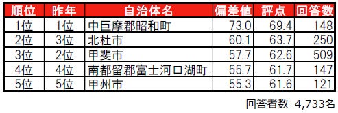 1位は東京23区(4年連続)と同率タイで、「住みここち」で1位の中巨摩郡昭和町が昨年4位から順位を上げてトップに並んでいます。トップ5では、南アルプス市が昨年から順位を上げて5位となっています。