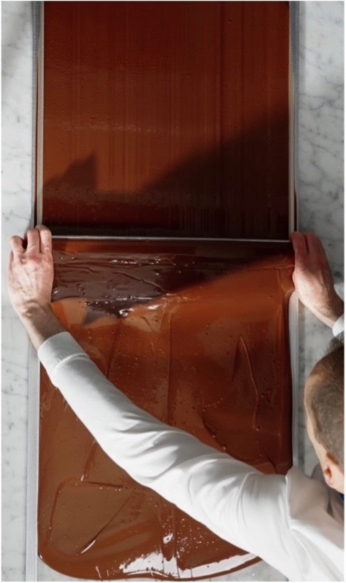 Step4:最後に、チョコレートを大理石の上に流し込み成形。