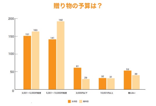 母の日のアンケートでは5千円以上1万円未満が42.3%とトップで、アンケート結果で見ると、予算は母高父低となっています。ただし、前年との比較では、物価高が加速する中でも半数が前年と変わらないとし、節約したいとの答えは5%に留まり、お父さんの存在感が保たれる見込みです。