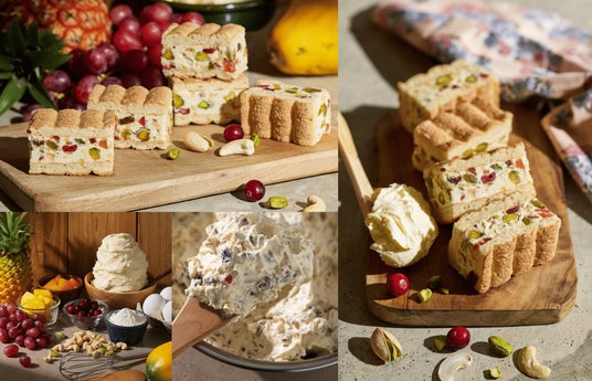 2025年6月1日(日)に販売を開始する新商品『果実とバターのサンド』は、ピスタチオ・カシューナッツ・パイナップル・パパイヤ・レーズン・クランベリーなど6種類の果実と、芳醇なバターをあわせたバタークリームを、香ばしく焼き上げたダックワーズ生地で、惜しげもなくサンドした、まさに“果実とバター”を感じていただける商品です。