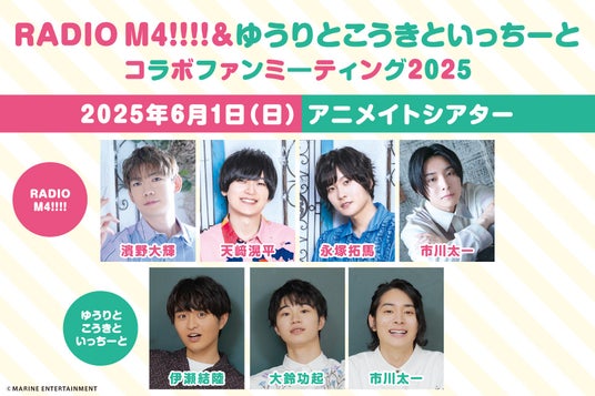 濱野大輝さん・天崎滉平さん・永塚拓馬さん・市川太一さんの4人によるラジオ番組『RADIO M4!!!!』と、伊瀬結陸さん・大鈴功起さん・市川太一さんによる企画『ゆうりとこうきといっちーと』がコラボ! アニメイト池袋本店地下2F多目的ホール・アニメイトシアターにて、コラボファンミーティングを開催します。