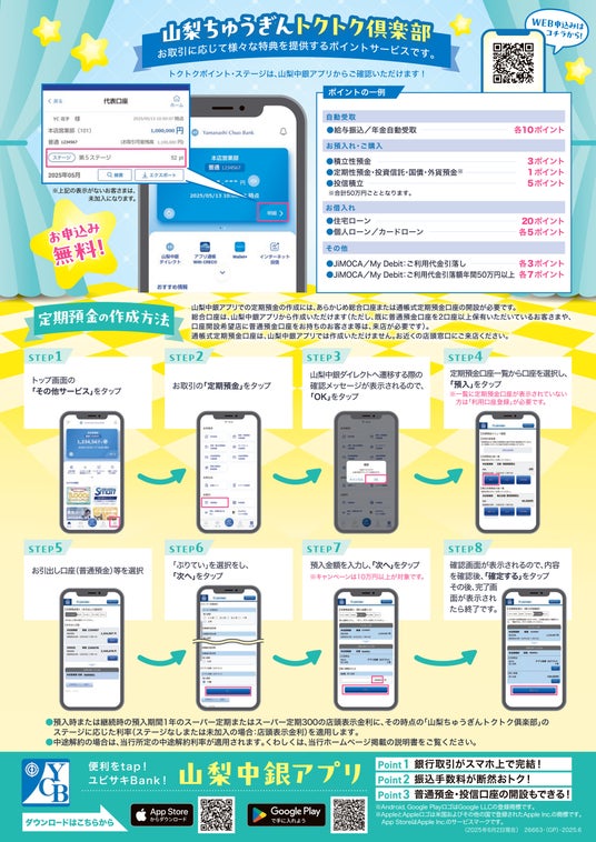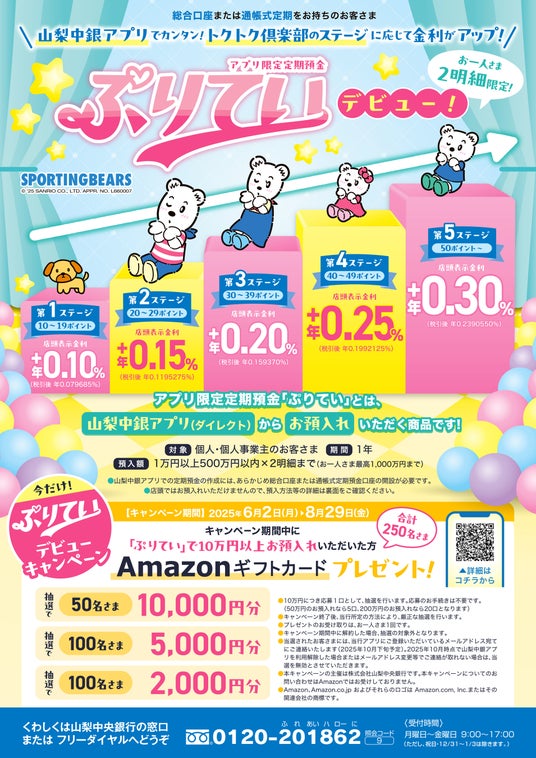 株式会社山梨中央銀行(頭取 古屋 賀章)は、「山梨中銀アプリ」(以下「アプリ」といいます)の利用者増加に伴い、お客さまの資産形成をご支援するため、「アプリ限定定期預金『ぷりてい』」(以下「ぷりてい」といいます)の取扱いを開始するとともに、キャンペーンを実施いたします。