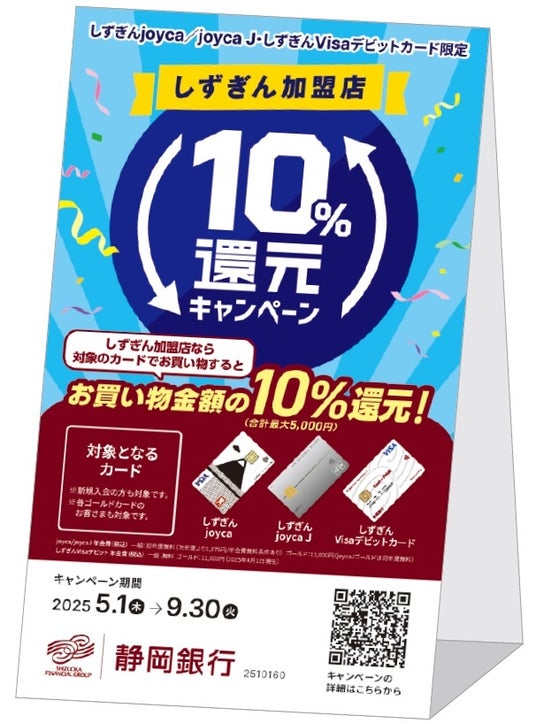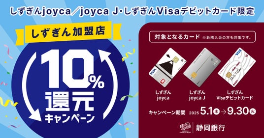 株式会社静岡銀行は、キャッシュレス事業のさらなる拡大と、当行取引先の「しずぎん加盟店」への送客によるエリア経済ネットワーク構築を目的に、2025年9月30日(火)までの期間中、当行が発行するクレジットカードおよびデビットカードをご利用いただいたお客さまを対象とした「しずぎん加盟店10%還元キャンペーン」を実施します。
