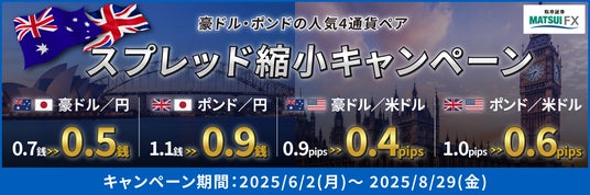 松井証券株式会社(本社:東京都千代田区、代表取締役社長:和里田 聰、以下「当社」)は、FX(外国為替証拠金取引)サービスにおいて、2025年6月2日(月)から8月29日(金)の3か月間、「豪ドル/円」・「ポンド/円」・「豪ドル/米ドル」・「ポンド/米ドル」のスプレッドを縮小するキャンペーンを開催いたします。