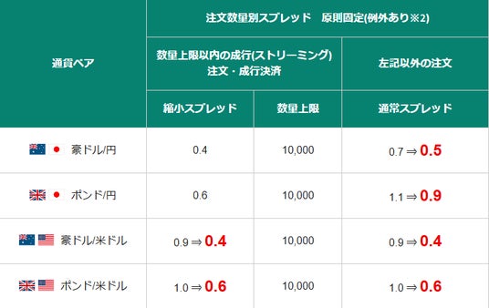 当社では、キャンペーン対象の4通貨ペアを含む全22通貨ペアにおいて、業界最狭水準*1のスプレッドを提供しておりますが、本キャンペーンにより、対象4通貨ペアの取引がさらにオトクになります。