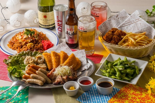 スカイビアガーデンコース(全8品)枝豆、ハムカツ、シュウマイ、ポテトフライ、