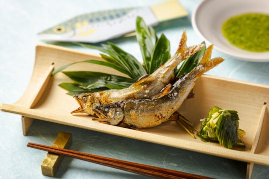 [焼き物]天竜鮎塩焼き 蛇腹胡瓜 いりごま 千切り茗荷 蓼酢味噌