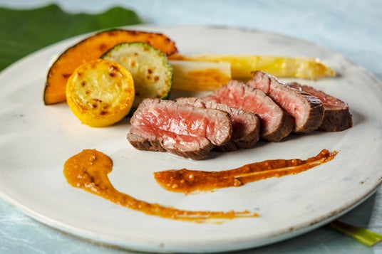尾崎牛は香ばしく、やわらかに焼き上げています。フルーティで辛味のある味噌ソースと、
