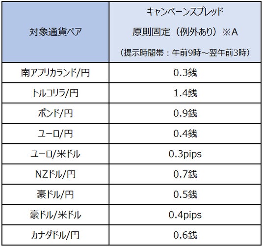 キャンペーンスプレッド掲示時間帯:対象期間中の各営業日午前9時~翌午前3時