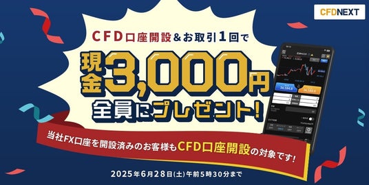 株式会社外為どっとコム(本社:東京都港区、代表取締役社長:竹内 淳)は、『CFDネクスト』におきまして、2025年6月2日(月)より「口座開設&お取引1回でもれなく現金3,000円をプレゼント!キャンペーン」を実施します。