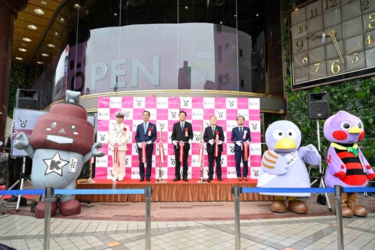 「TSUNAGARU ムービー」上映後は、新藤義孝 様、大野元裕 様、奥ノ木信夫 様、葭葉智昭 様、藤林秀輔に加えて、埼玉県マスコットキャラクターのコバトン、さいたまっちと川口市マスコットキャラクターのきゅぽらんも登壇し、グランドオープン記念のテープカットが執り行われました。