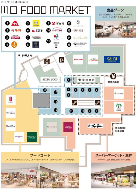 ららテラス川口には、埼玉県初出店8店舗を含む、地域の皆さまの生活ニーズを満たす全94店舗が集結しております。中でも日常の「食」を支える「川口 FOOD MARKET」では、フードコートやバラエティ豊かな食物販店など日々の食卓を彩る生鮮食品から惣菜品、和・洋菓子まで全30店舗が地下1階に出店いたしました。食品ゾーンでは、惣菜、お弁当、ベーカリーや和洋菓子など、買っておうちで楽しめる商品が揃います。またフードコートエリアでは、温かいごはんものからスイーツまでイートイン、テイクアウトどちらでも利用が可能です。その他スーパーマーケットや生鮮色品が揃うエリアでは活気あふれる店内で新鮮な青果、鮮魚、精肉が集結しており、多彩な店舗ラインナップを揃えて、お客様をお迎えいたしました。