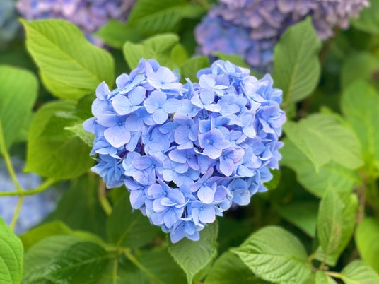 6月頃には、約2ヘクタールの敷地に約100品種10万本のアジサイが咲き乱れます。梅雨空の下、色鮮やかに咲き誇るアジサイは、見る人の心を和ませます。