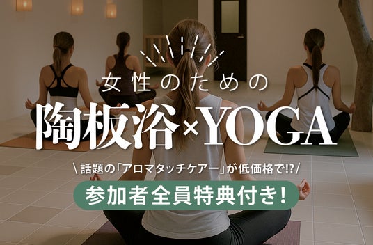 話題の「アロマタッチケアー」が低価格で体験できる特典付き。陶板浴とヨガの相乗効果で心も体もリフレッシュ。