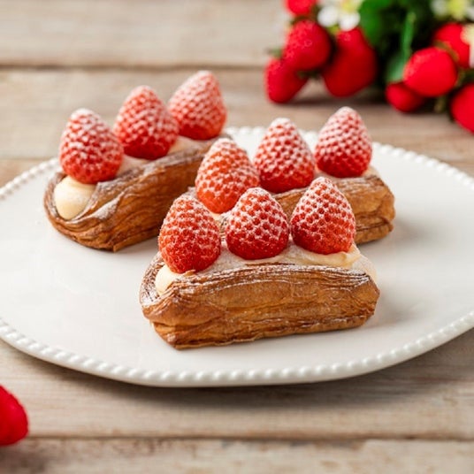 【北海道産いちごのスティックミルフィーユ】700円(税込)ザクザク食感の生地に、北海道産いちごと白い恋人のホワイトチョコレートを使用したカスタードクリームを合わせました。