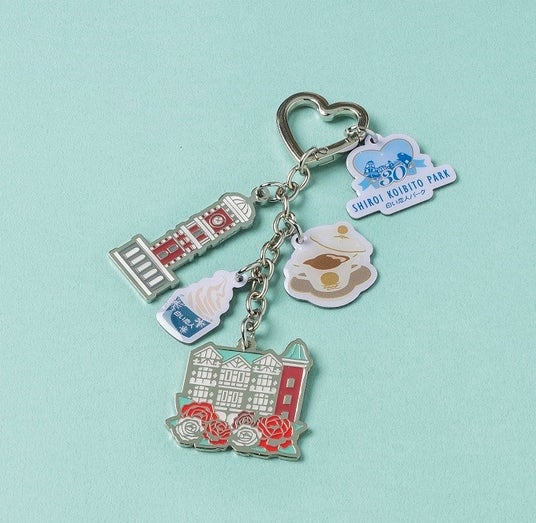 【白い恋人パーク30周年アニバーサリー キーホルダー】1,200円(税込)からくり時計塔やチュダーハウスなど、白い恋人パークの特徴的なモチーフのパーツがついたキーホルダー。