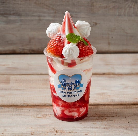 白い恋人ソフトクリームホワイト、いちご、ホイップクリーム、メレンゲを混ぜながらお召し上がりください。