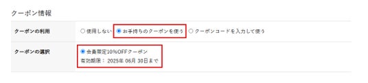 会員様はご注文の決済時に、クーポン情報欄で「お手持ちのクーポンを使う」にチェックを入れてください。「会員限定10%OFFクーポン」が表示されます。