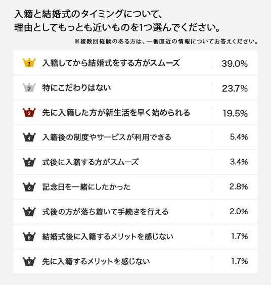 Q. 入籍と結婚式のタイミングについて、理由としてもっとも近いものを1つ選んでください。