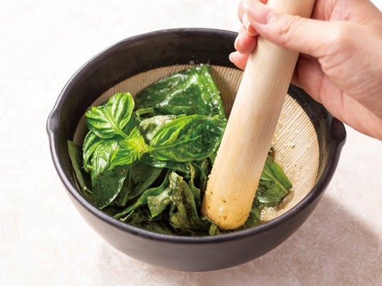 バジルを擦りながら豊かな香りを味わい、更に、より一層豊かな香りをまとったジェノベーゼソースを最高の状態でご堪能いただけます。
